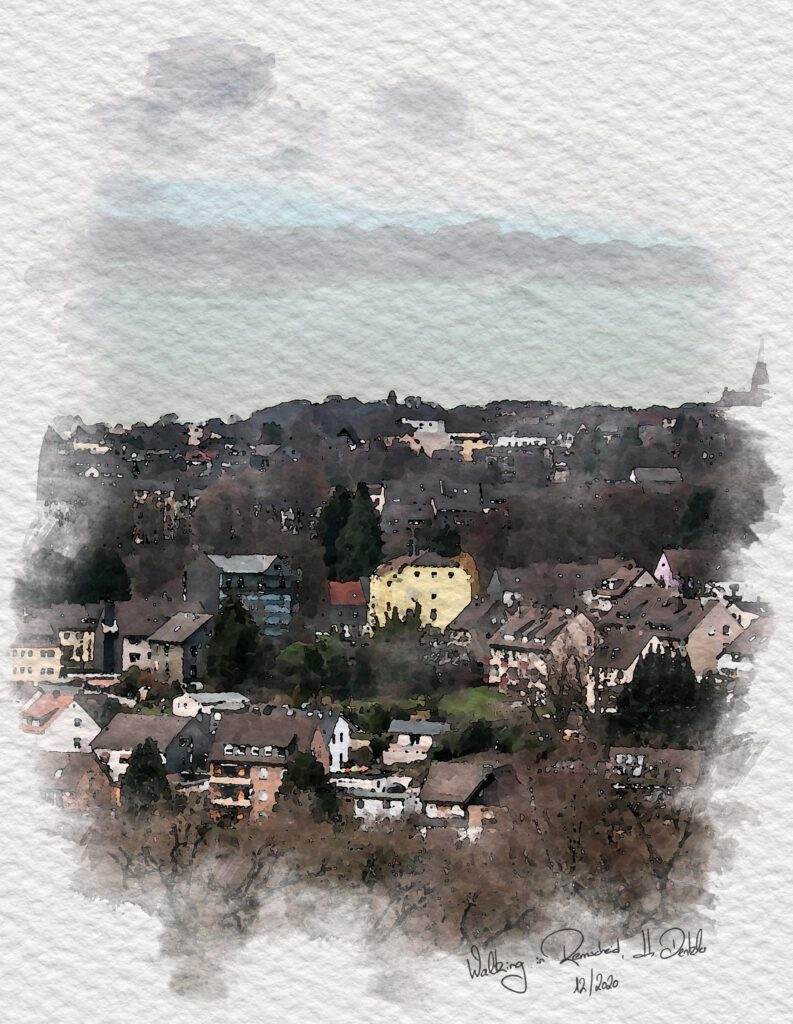 Eine Aufnahme von der fünften Wanderung durch Remscheids Straßen: der Blick auf das Blumental von Ehringhausen aus, bearbeitet als Aquarell.